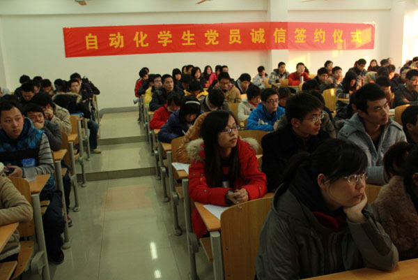 临近期末,为了在全院营造诚信考试氛围,树立良好考风,充分发挥学生党员的先锋模范带头作用,太阳城集团在 本月初启动了学生党员学风考风示范月活动,并于12月14日下午在教四409举行了系列活动之一学生党员诚信签约仪式。学院党委副书记高志华老师、党委组织员陈素兰老师、分团委书记叶晓勤老师和2009级辅导员赵梓竹老师以及全体研究生和本科生学生党员参加了签约仪式。