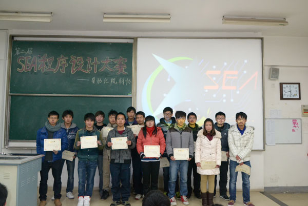 2012年12月19日,由自动化学院科协主办的第二届“SEA杯”程序设计大赛圆满落幕。自动化院科协前研发部副主任王福、前研发部成员王献东、现任副主席刘赟、赵孔明和研发部主任石剑桥等人担任本次活动评委。