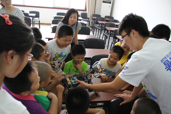 机器人创新实践基地主席、2013年robocup世界杯3D仿真组冠军获得者自动化11级赵赫成同学与孩子们互动