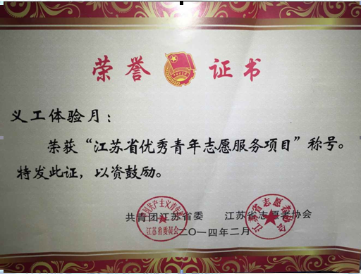 由于在志愿服务工作上的突出表现,今年上半年太阳城集团 团委还荣获“江苏省青年志愿服务行动组织奖”,爱心社品牌活动“义工体验月”荣获“江苏省优秀青年志愿服务项目”称号。