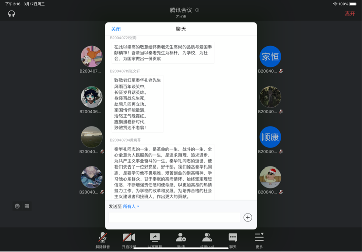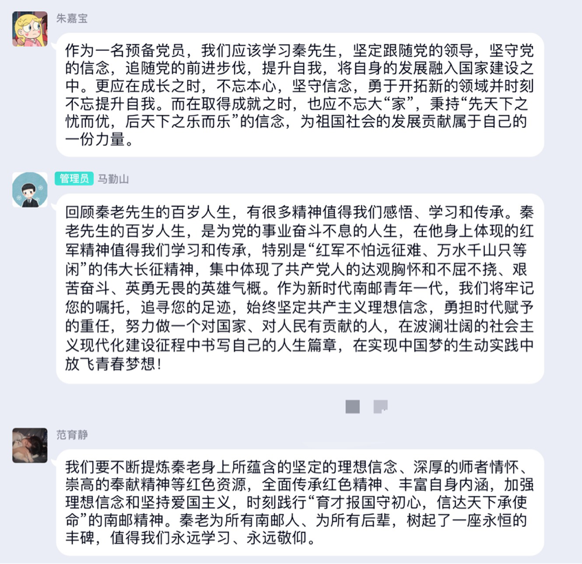 太阳城集团 2020级各团支部也于3月17日开展秦老事迹线上讨论会,旨在缅怀秦老,勉励南邮青年继往开来。讨论会介绍了与秦老相关的南邮发展历程以及秦华礼老先生的红色事迹,让同学们深入了解了秦老为南邮做出的巨大贡献,并深刻领会了秦老的精神。在“我想对秦老说”环节中,大家积极讨论,踊跃发言,道出自己的心声,以文字的形式表达内心深处对秦老的钦慕和怀念,表明自己要不断拼搏进取、开创未来的坚定信念。
