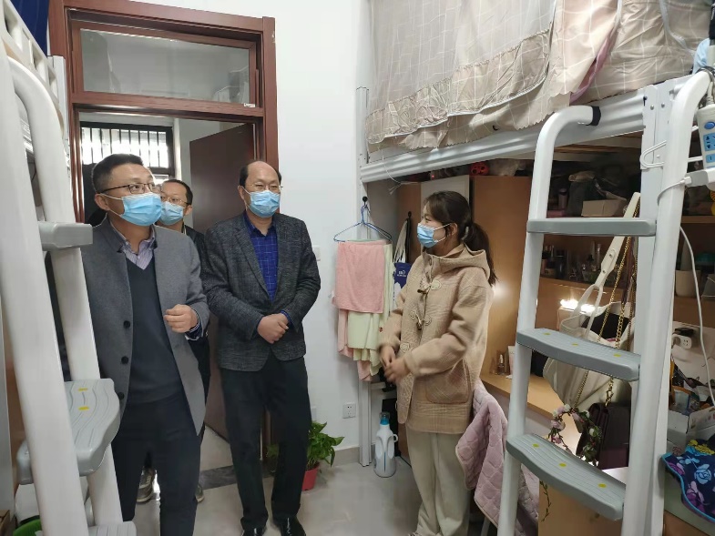 321日,为进一步做好疫情防控工作,加强学生寝室管理,自动化学院、人工智能学院党委书记张翼、党委副书记孙委委、2021级辅导员郑春春、谢子行、范艺等老师来到学院学生宿舍走访慰问。张翼书记一行来到学生宿舍,仔细查看学生生活环境,了解学生近期网课学习效果,与学生进行亲切交流。张书记十分关心同学们的生活状况、学习质量、课余锻炼情况,提醒同学们要做好疫情防控,养成良好生活习惯,营造积极向上的学风。