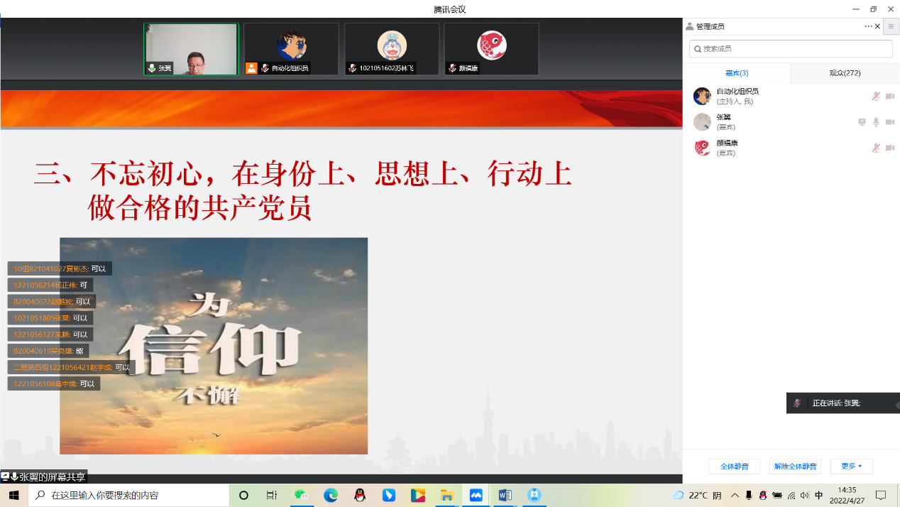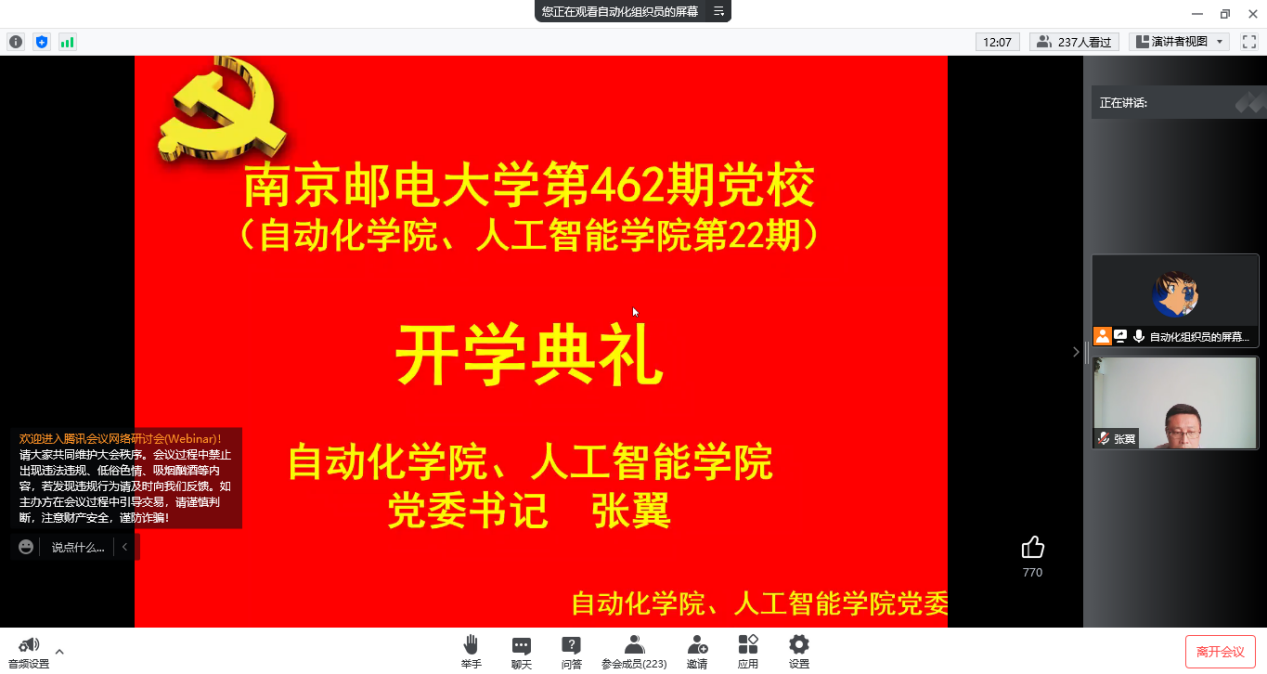 2022年4月27日,南京邮电大学第462期暨自动化学院、人工智能学院第22期入党积极分子党校培训班顺利开班。学院党委深入学习贯彻习近平总书记关于疫情防控的重要指示精神,坚决落实中央、省委疫情防控决策部署和校党委具体要求,本期培训班教学活动采用线上形式举行,由自动化学院、人工智能学院党委书记张翼主持。