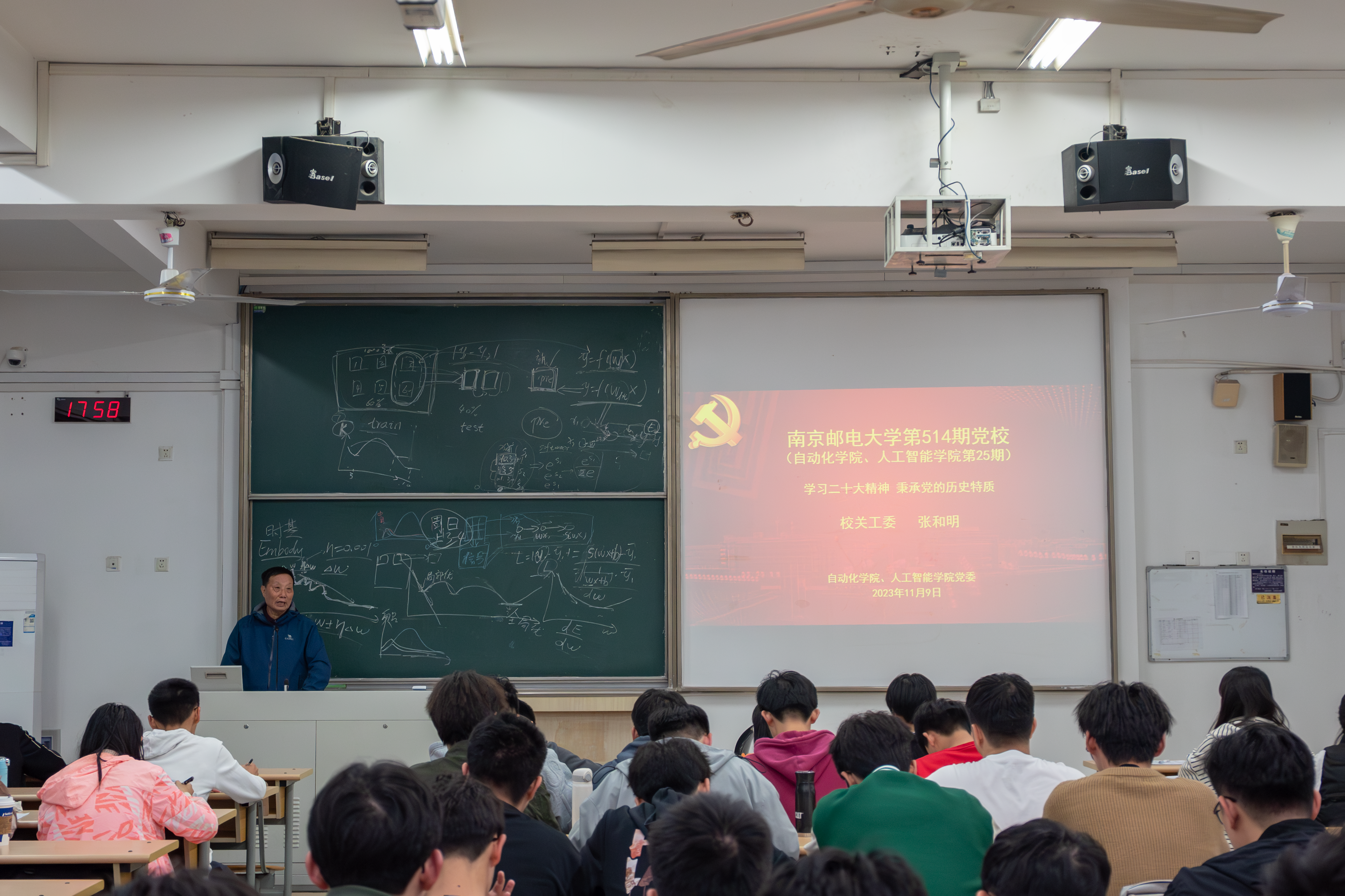为深入学习贯彻党的二十大精神,激励广大青年学生牢记初心使命,11月9日,太阳城集团 第25期入党积极分子培训班举办了以“学习二十大精神,秉承党的历史特质”为主题的教育讲座。校关工委张和明主讲。