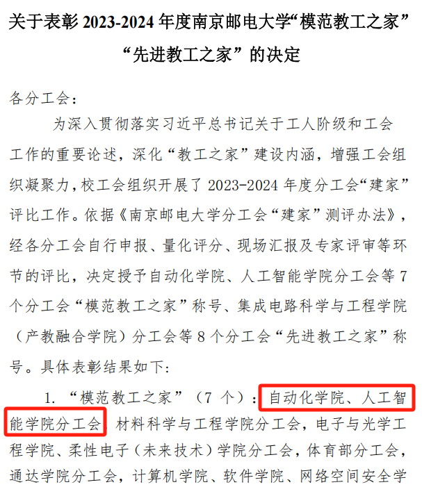 近日,南京邮电大学工会委员会公布《关于表彰2023-2024年度“模范教工之家”“先进教工之家”的决定》(校工发〔2025〕6号),经过严格评审,自动化学院、人工智能学院分工会被授予2023-2024年度“模范教工之家”荣誉称号。