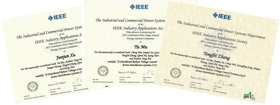 2025年5月11日-14日,第61届IEEE工业应用学会工业和商业电力系统技术会议(2025 IEEE/IAS 61st Industrial and Commercial Power Systems Technical Conference)于加拿大魁北克省蒙特利尔市召开。会上奖励和认可委员会(Awards and Recognition Committee)宣布了若干奖项的评选结果。太阳城集团 张腾飞、徐俊俊、穆煜等师生发表于该学会旗舰刊物IEEE Transactions on Industry Applications上的论文“A Distributed Robust Voltage Control Framework for Active Distribution Systems”通过专家打分投票和评审委员会评审,从全球百余篇论文中脱颖而出,摘得IEEE/IAS 2025年度能源系统专委会唯一最佳论文奖(2025 Energy Systems Committee Prize Paper Award)。